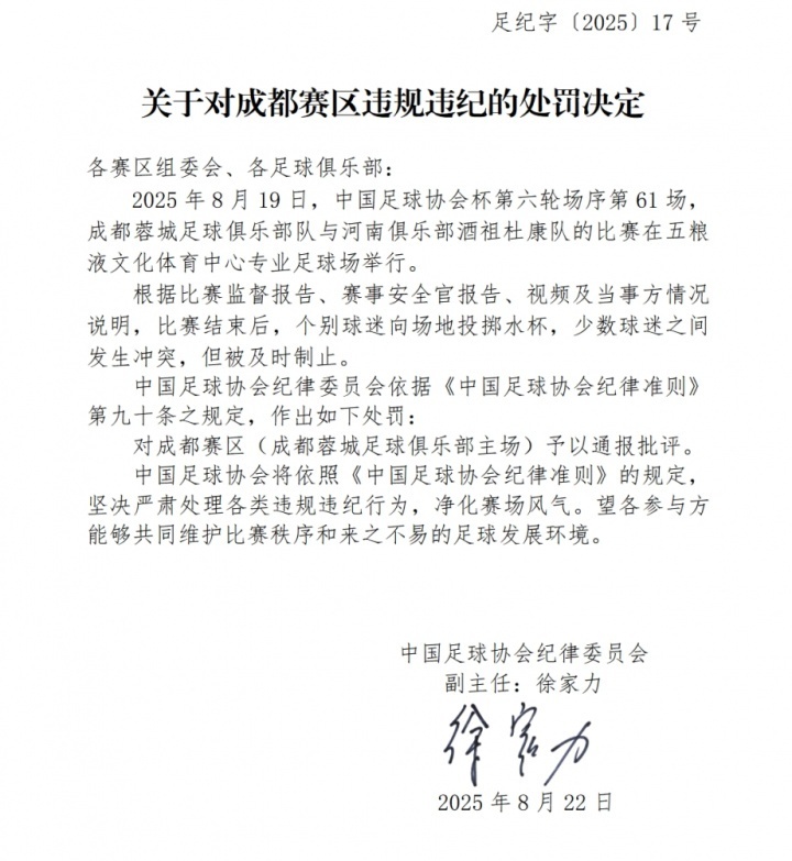 周五,中国足协公布对成都蓉城的处罚结果。因在足协杯半决赛对河南队一战,球迷向场内投掷水瓶并且发生冲突,成都蓉城被通报批评。